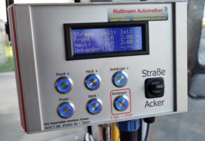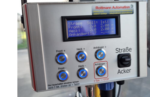 Steuerung „easyfill“- Eine Steuerung für alle Aufgaben.- Der Ackerdruck und Straßendruck ist für jede Achse einzeln über 6 Drucktaster einstellbar.- Bei Wechsel von Straße auf Acker ist nur ein Schalter zu betätigen und die Regelung des voreingestellten Druckes beginnt.- Das Regelverhalten bei unterschiedlichen Reifen wird automatisch errechnet, es ist keine weitere Einstellung notwendig.- Sind Reifendrücke über oder unterschritten wird dieses automatisch erkannt und es erfolgt ein akustisches und optisches Signal.- Jede Achse kann einzeln aus bzw. eingeschaltet werden.- Durch die geringen Abmessung der Bedieneinheit wird nicht unnötig viel Platz in der Kabine verbaut.